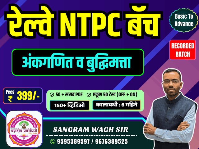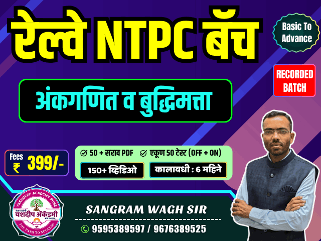 विषय : संपूर्ण अंकगणित व बुद्धिमत्ता (Basic to Advance) मार्गदर्शक : संग्राम सर तलाठी, ग्रामसेवक, पशुसंवर्धन, वनरक्षक, राज्य उत्पादन शुल्क विभाग, जिल्हा परिषद, नगर परिषद, कृषी सहाय्यक, कृषी सेवक, अंगणवाडी पर्यवेक्षक व इतर सर्व सरळसेवा परीक्षासाठी उपयुक्त कोर्सेस # Digital Board द्वारे विषयाची प्रभावी मांडणी # सर्व लेक्चर्स Recorded स्वरूपात उपलब्ध # कोर्स कालावधी: 6 महिने (कोर्स खरेदी केलेल्या दिनांकापासून) # सरावासाठी pdf स्वरूपात प्रश्नसंच दिले जातील माहितीसाठी संपर्क: 9595389597 (Sangram sir)