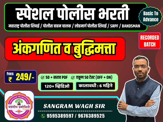 विषय : संपूर्ण अंकगणित व बुद्धिमत्ता (Basic to Advance) मार्गदर्शक : संग्राम सर तलाठी, ग्रामसेवक, पशुसंवर्धन, वनरक्षक, राज्य उत्पादन शुल्क विभाग, जिल्हा परिषद, नगर परिषद, कृषी सहाय्यक, कृषी सेवक, अंगणवाडी पर्यवेक्षक व इतर सर्व सरळसेवा परीक्षासाठी उपयुक्त कोर्सेस # Digital Board द्वारे विषयाची प्रभावी मांडणी # सर्व लेक्चर्स Recorded स्वरूपात उपलब्ध # कोर्स कालावधी: 6 महिने (कोर्स खरेदी केलेल्या दिनांकापासून) # सरावासाठी pdf स्वरूपात प्रश्नसंच दिले जातील माहितीसाठी संपर्क: 9595389597 (Sangram sir)